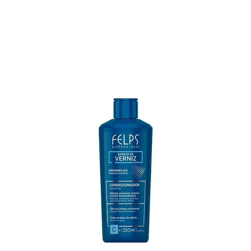 O Felps Condicionador Banho de Verniz 250ml promove hidratação diária com brilho espelhado e toque aveludado. Indicado para todos os tipos de cabelo, recupera a vitalidade dos fios ressecados e realça a cor natural ou tingida.