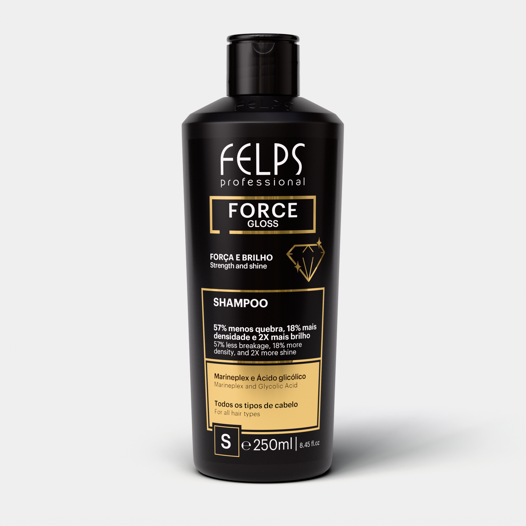 Modo de usar: Aplique o shampoo nos cabelos molhados, massageando até formar espuma. Enxágue bem e repita a aplicação, se necessário. Para resultados ainda melhores, utilize junto com a linha Force Gloss Felps.